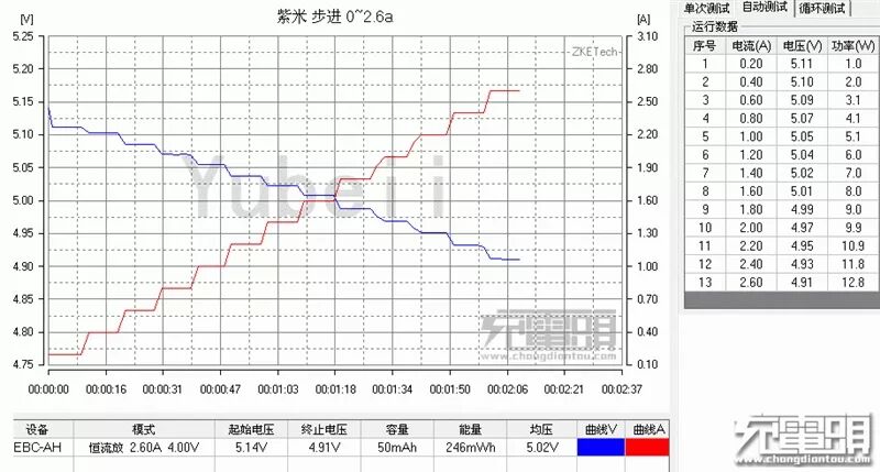 这里我们以0.2A为步进,从5V 0.2A到2.6A进行了13档输出负载测试,最终得到ZMI PB810的过流保护点为:2.6A。不超过过流保护点,充电设备均能正常工作。