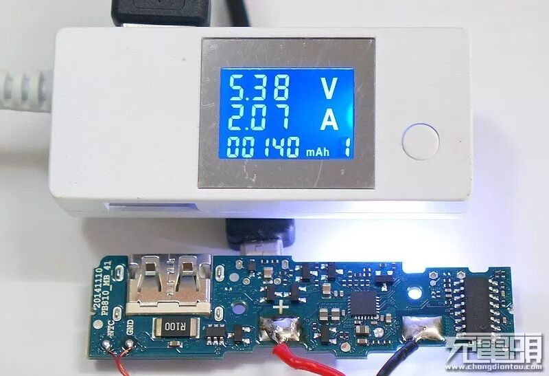 这里我们使用了三星原装线补充电器测试,白尾巴二代电流表检测到了5.38V 2.07A电压电流,充满ZMI PB810只需5个小时左右。