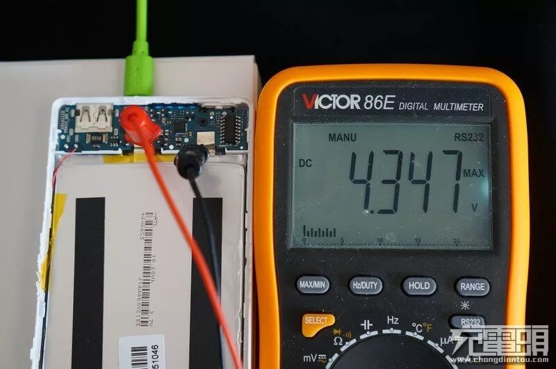 通过充电测试,我们将ZMI PB810充电到4颗LED电量指示灯长亮,胜利86E万用表监测到的正负极电压为4.347V,充电截止电压没有超过4.35V,不用担心过充对电池和人体的安全伤害。
