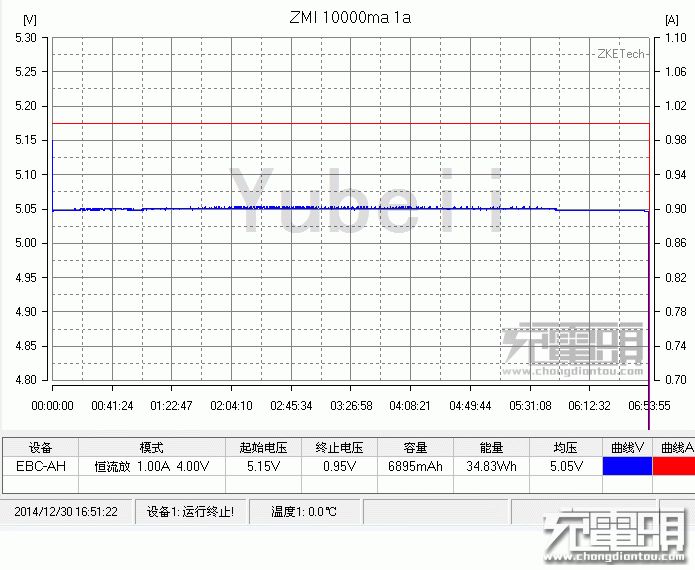 ZMI PB810以5V 1A进行放电,经过6小时53分钟55秒后得到了6895mAh,34.83Wh,除以额定37Wh,得到94.13%效率,达到铭牌中标注的大于90%效率,没有虚标。