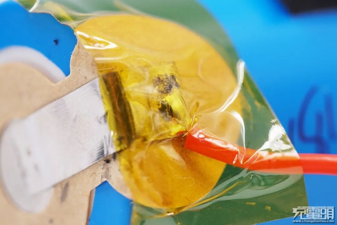 导线和镍片焊接处焊点饱满,并且还使用绝缘胶带固定绝缘。