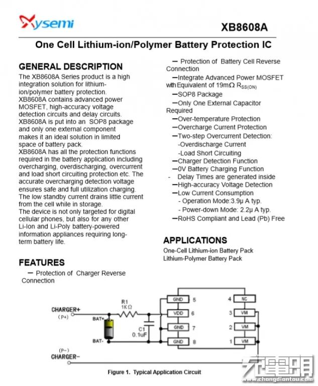 苏州XYsemi赛芯微XB8608A 一体化低内阻锂电保护IC,为电池提供过充过放保护。
