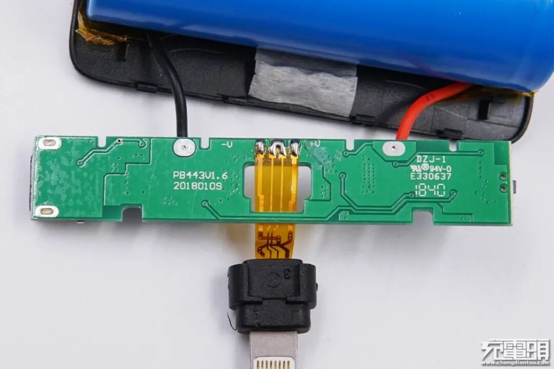暴力拆开外壳,移动电源内部采用一节26650电池,可以看到电芯个头非常大,几乎占据了内部的全部空间。