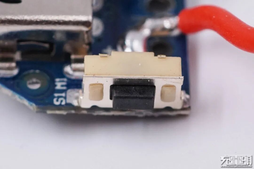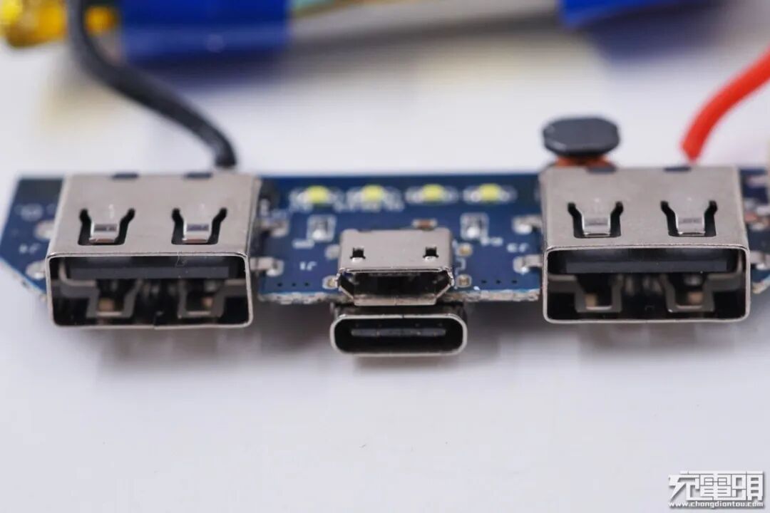 USB-A接口母座沉板过孔焊接,两个输入接口分别焊接在PCB板正背面,如此设计可充分利用内部空间,有效降低移动电源的厚度。