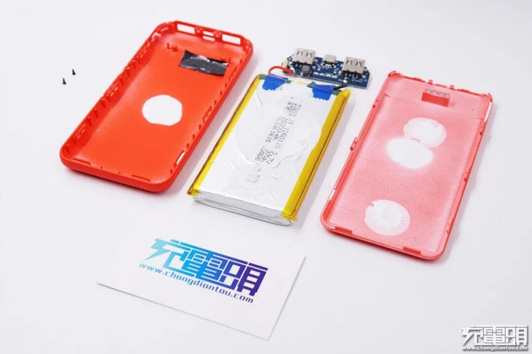 将机身壳拆开,可以看到电芯打胶进行固定,电芯和PCB板交界处使用青稞纸和胶带等进行包裹绝缘。
