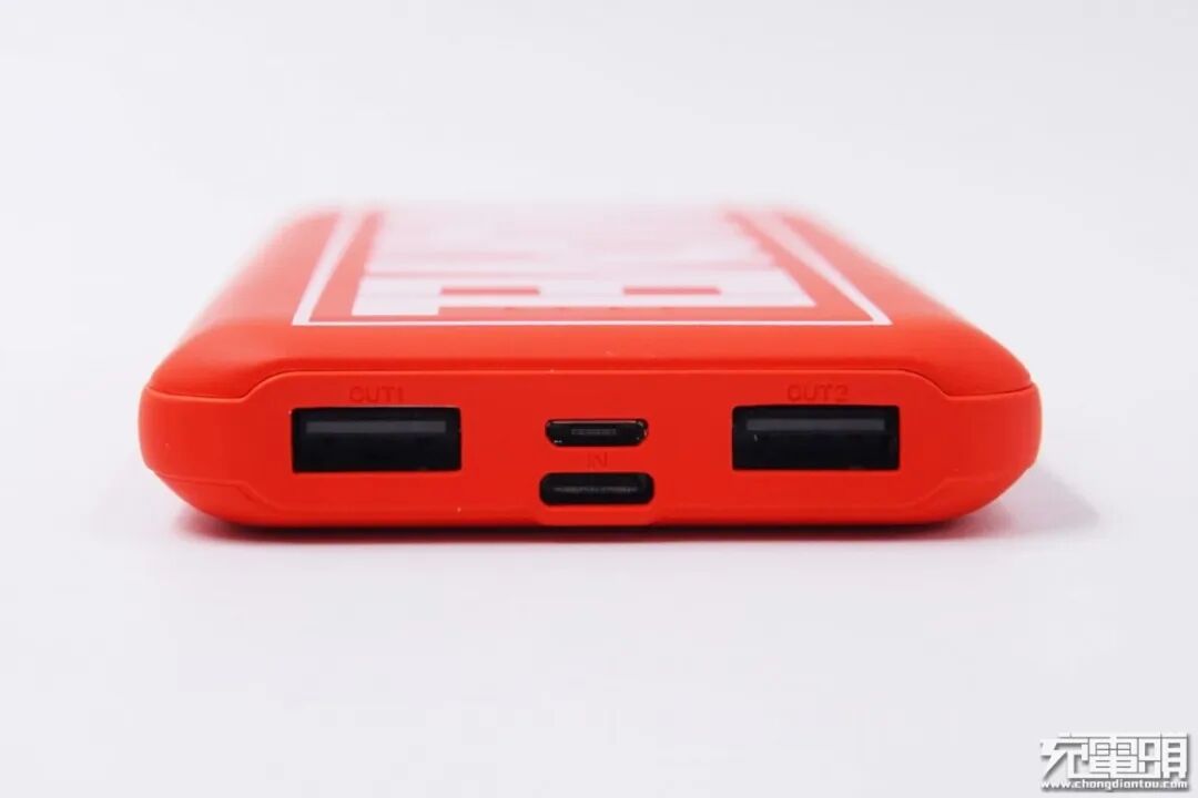 移动电源顶部有两个USB-A输出接口,并在接口旁边凹印OUT1和OUT2字样,中间是USB Micro和USB-C输入接口。