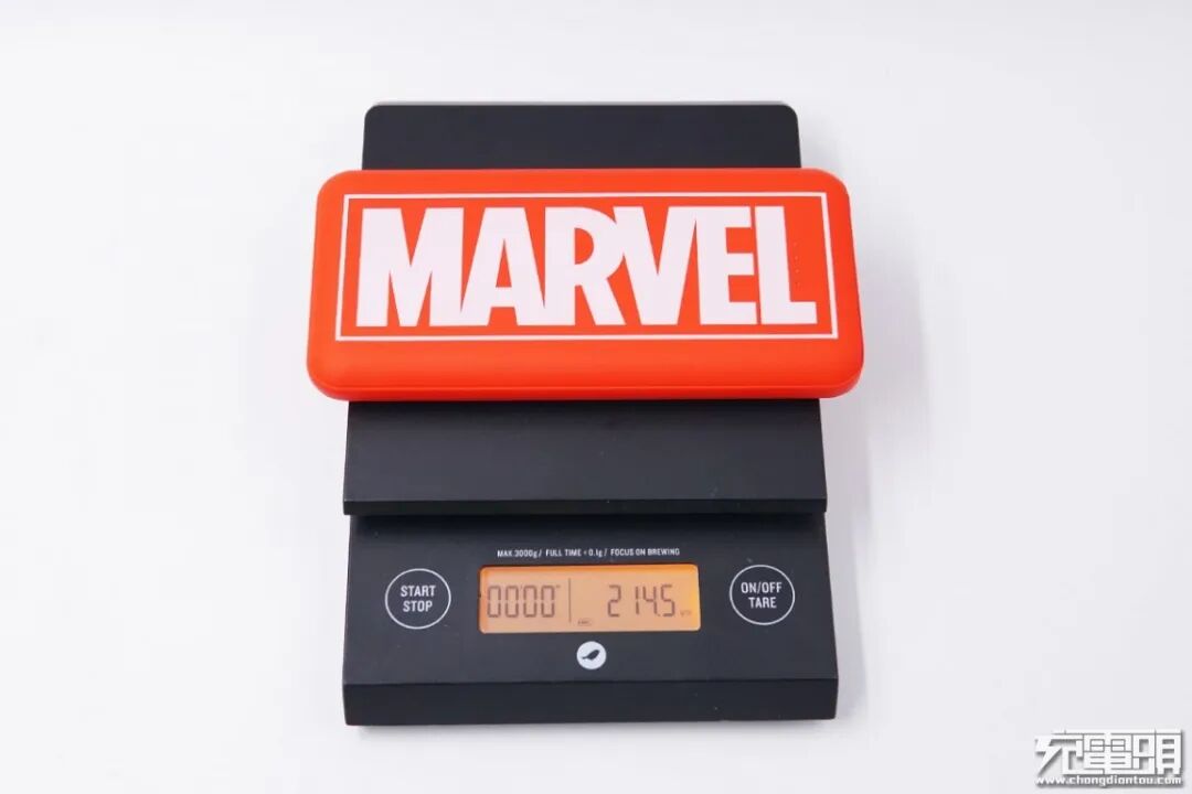 正面除了印有MARVEL字样还配有四颗LED电量指示灯,工作时亮白光。