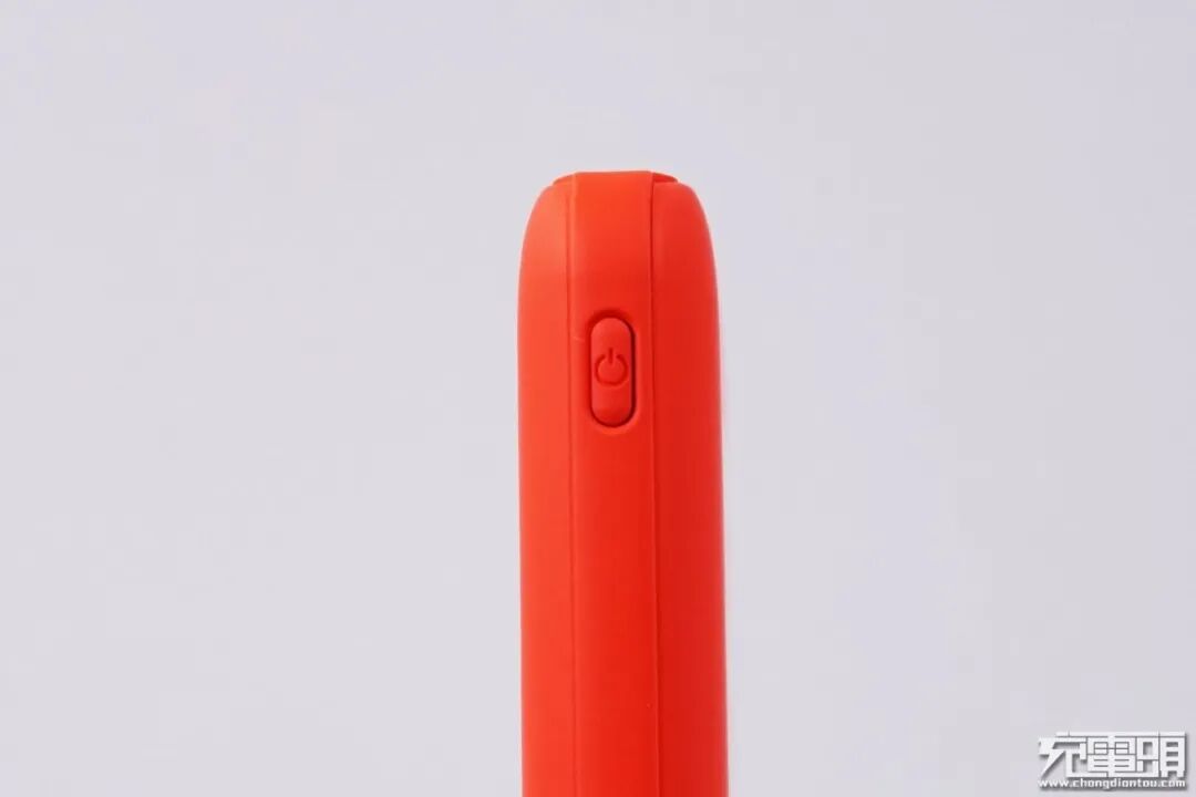 移动电源外观设计和包装盒一样,通体红色且机身正面同样印有MARVEL字样。机身扁平圆润,正背面晒纹处理,并且还具有类肤手感,上手舒适。