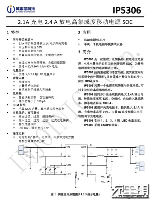移动电源主控来自英集芯IP5306,这是一款集成升压转换器、锂电池充电管理、电池电量指示的多功能电源管理SOC,只需一个电感实现降压与升压功能。同步升压系统提供最大 2.4A 输出电流,转换效率高至 91%。空载时自动进入休眠状态,静态电流降至 50uA。芯片外围器件少,可以有效减小整体方案的尺寸,降低BOM成本。