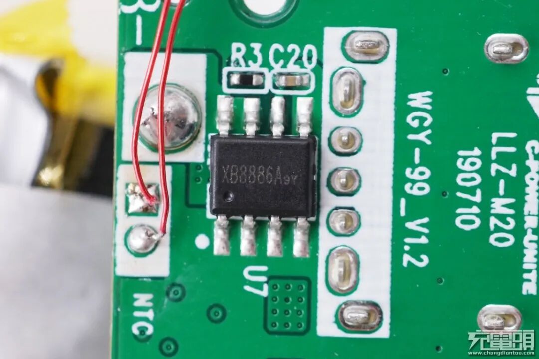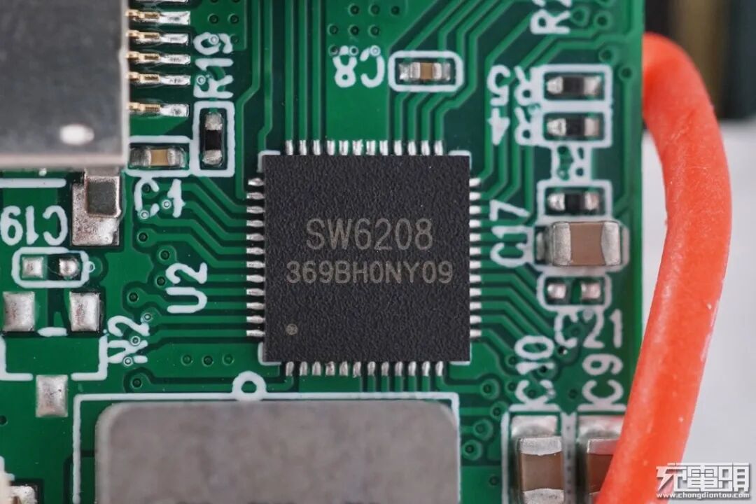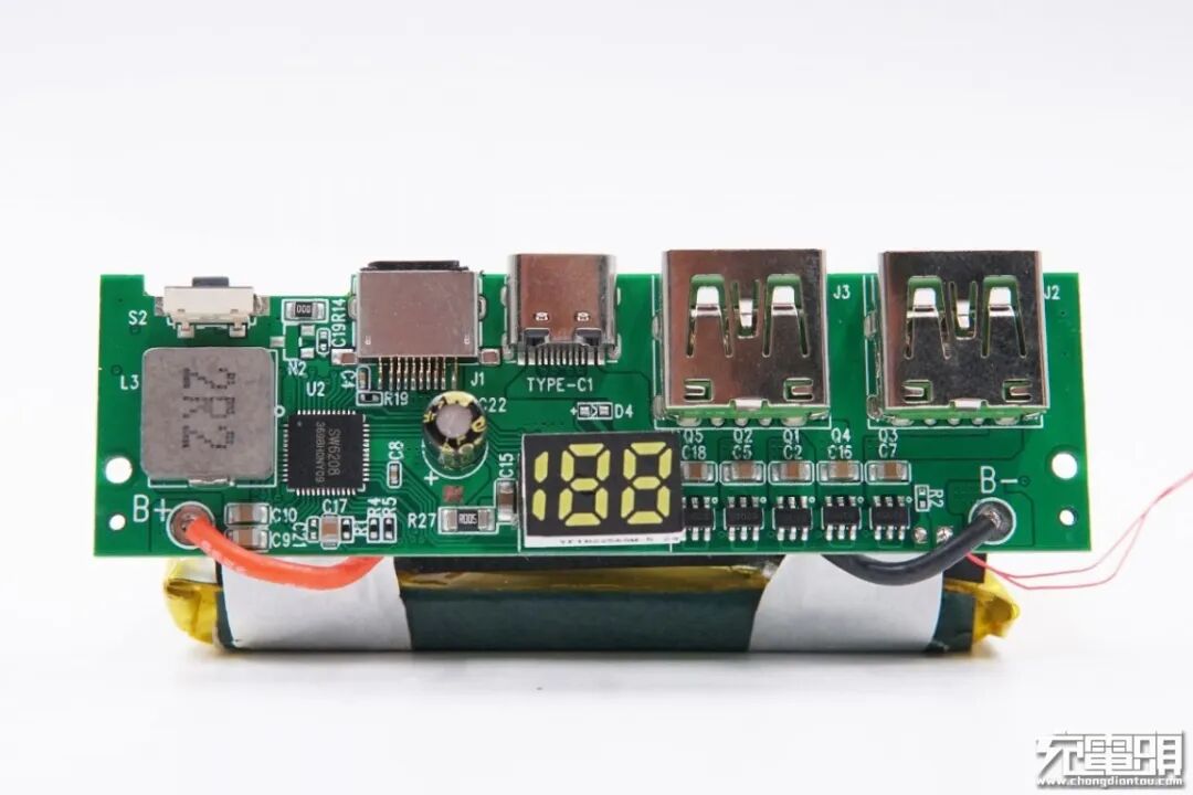 充电头网通过拆解发现,电源内部采用智融SW6208方案,该方案是一款高集成度的多协议双向快充移动电源专用多合一芯片,支持多种快充协议,性能强大,极具成本优势。此外使用赛芯微XB8886A一体化锂电保护芯片对电芯进行过充过放保护,并且电芯固定牢固,配有热敏电阻检测温度,绝缘保护措施到位,接口母座过孔焊接,更加牢固耐用。