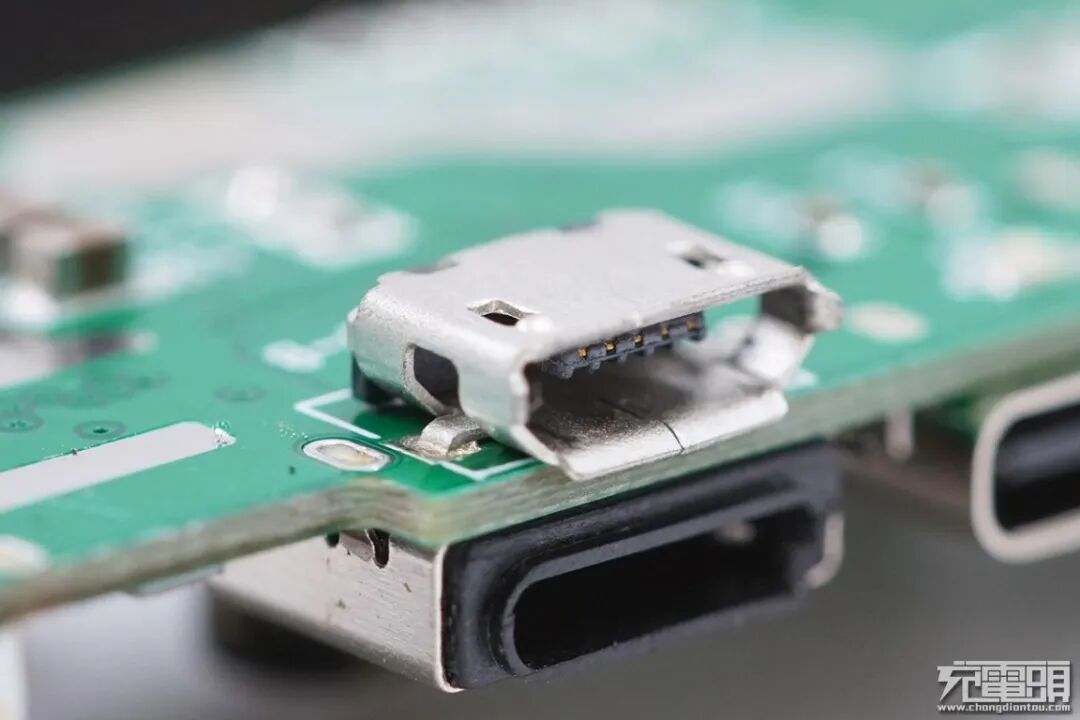 Micro USB1母座特写,贴片过孔焊接在PCB板背面。