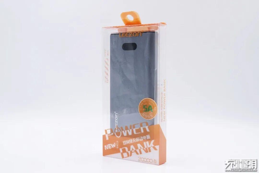 产品采用透明塑料包装盒,包装盒上端带有挂钩设计,可以方便产品展卖,包装盒正面印有LEEZON品牌和移动电源名称,此外还有20000mAh容量和5A电流两个产品特性。