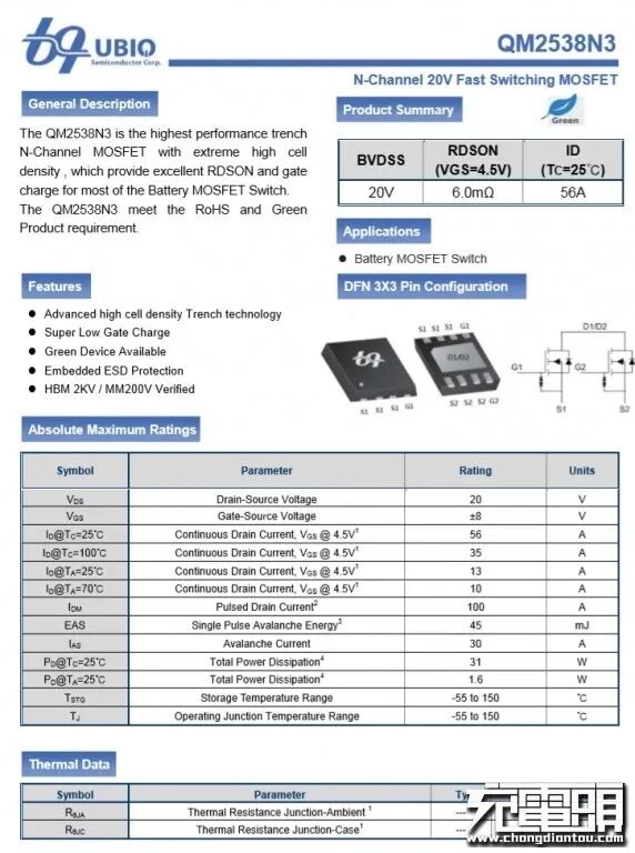 UBIQ QM2538N3 双NMOS管,耐压20V,导阻6.0mΩ,用于端口切换。