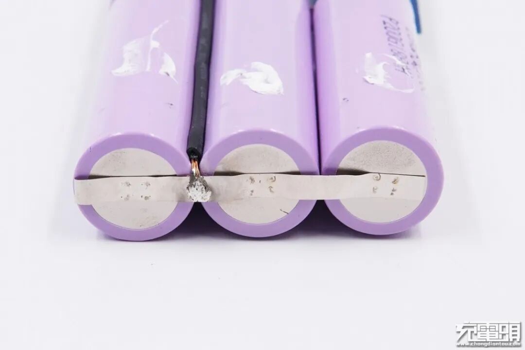 另外三颗电芯的一极同样使用焊片进行点焊连接,而前面那根长导线则与这块焊片焊接在一起,从而使五颗电芯达到并联的效果。