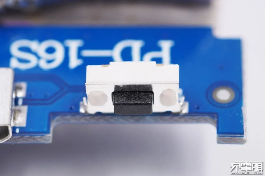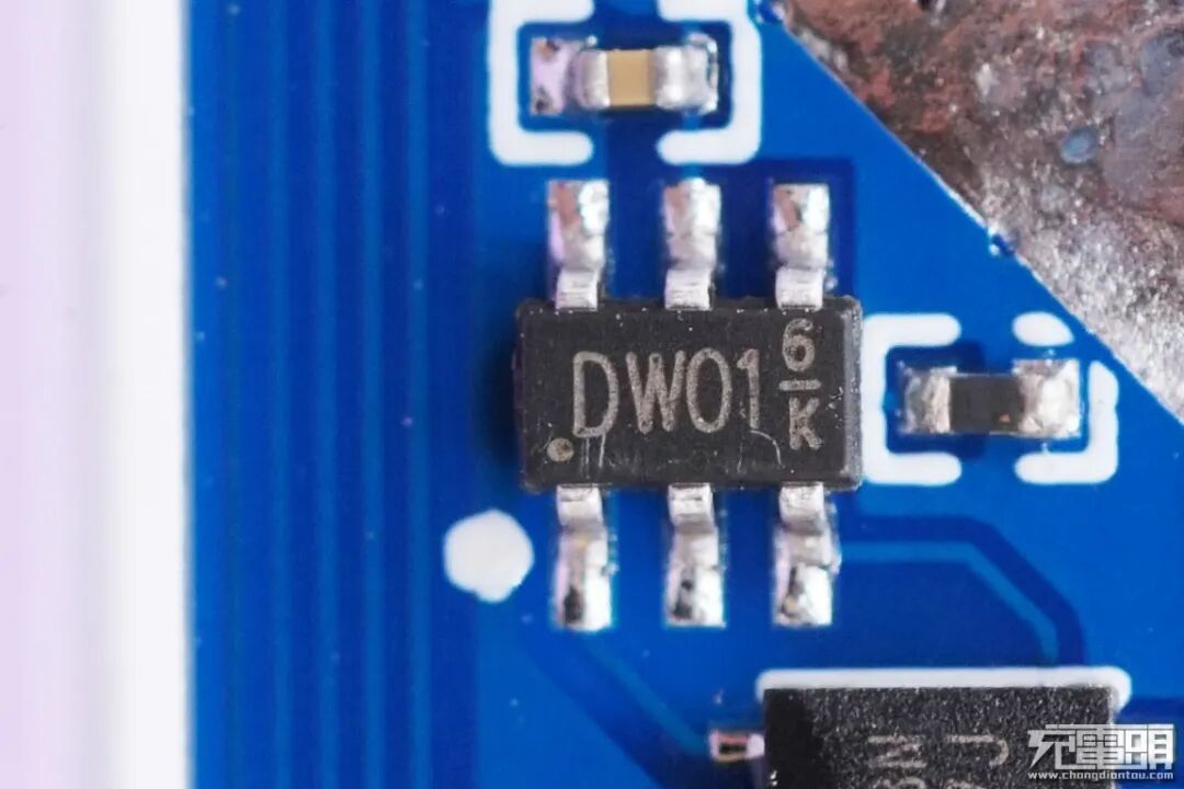 PCB板背面一览,设有电芯保护IC和MOS管,SW6208芯片对应位置大面积露铜加锡,增强导热降低温度。