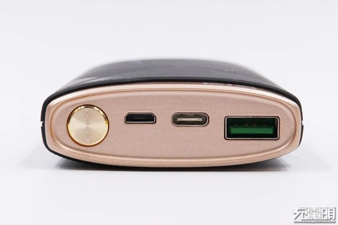 移动电源顶部配有电源开关键、Micro USB输入接口、USB-C双向快充口和USB-A输出接口。