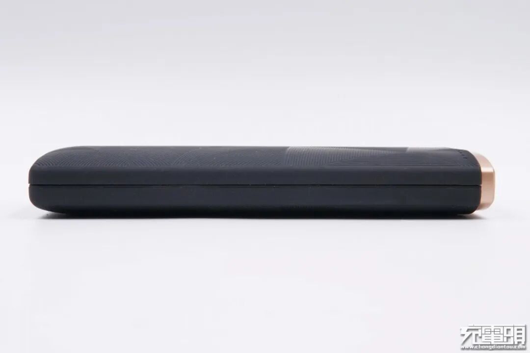 移动电源整体修长扁平,易于携带,机身黑色部分均为斜纹设计,手感舒适;顶部为光滑金属外壳,表面进行阳极氧化处理呈棕色。