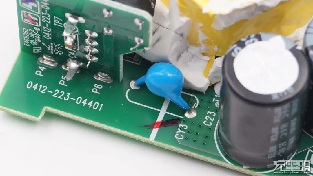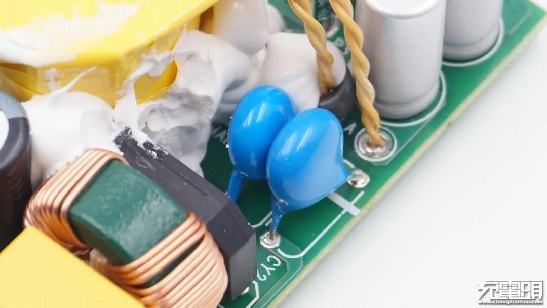 两颗输出抗干扰蓝色Y电容,横跨在初级次级之间。