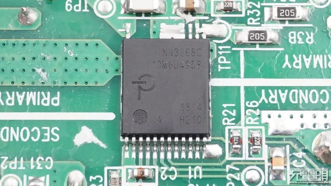 来自PI的INN3268C主控芯片,这款芯片集成了650V/750V初级开关MOS、同步整流、FluxLink反馈和恒功率特性的离线反激式恒压/恒流准谐振开关电源IC,支持55W输出功率。