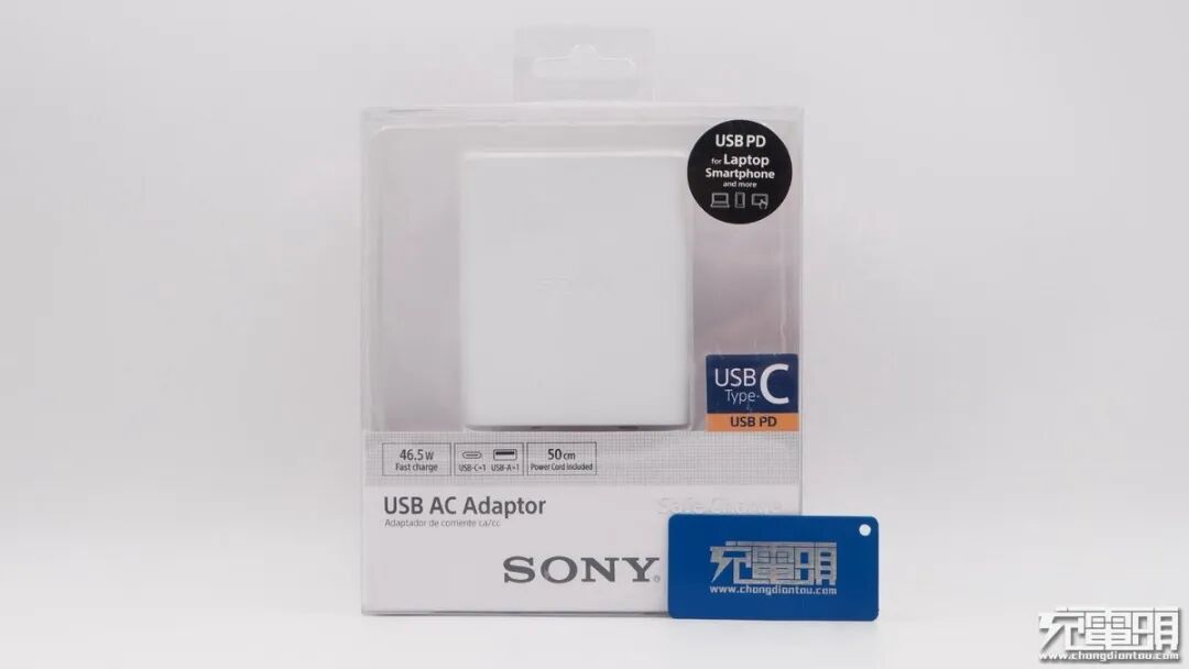 包装盒采用透明塑料壳加硬纸板设计,并且上端带有挂钩,方便商家展卖。盒子上印有充电器名称——USB AC Adaptor,下面印着“SONY”品牌logo,外壳上贴有USB-C标签。