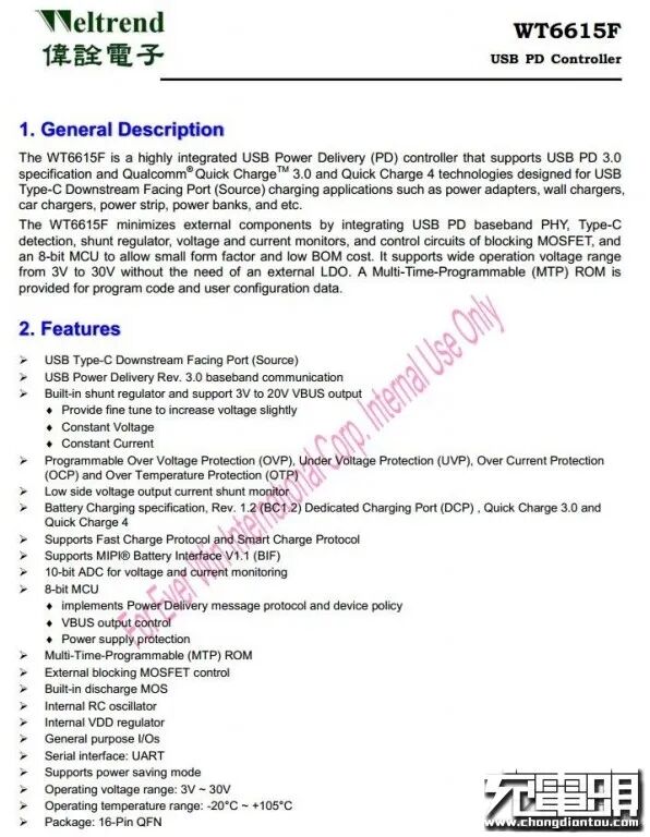 USB PD协议IC采用Weltrend伟诠的WT6615F。这是一颗支持USB PD 3.0规范和高通QC3.0和QC4技术的USB PD控制器,支持DFP下行端口(源)充电应用。高度集成的WT6615F可以应用于适配器、车充、移动电源等设备。同时伟诠WT6615F支持USB PD最新的Programmable Power Supply(PPS)规范,通用于移动设备的直充方案。