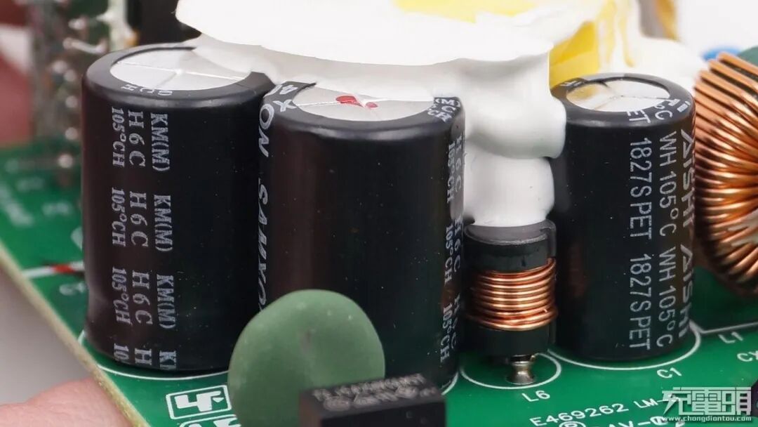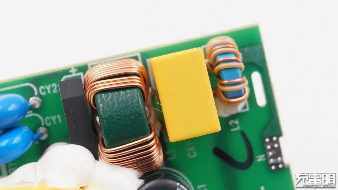 两颗共模电感磁芯分别是蓝色漆和绿色漆,用于滤除EMI干扰。夹在中间的是安规X电容。