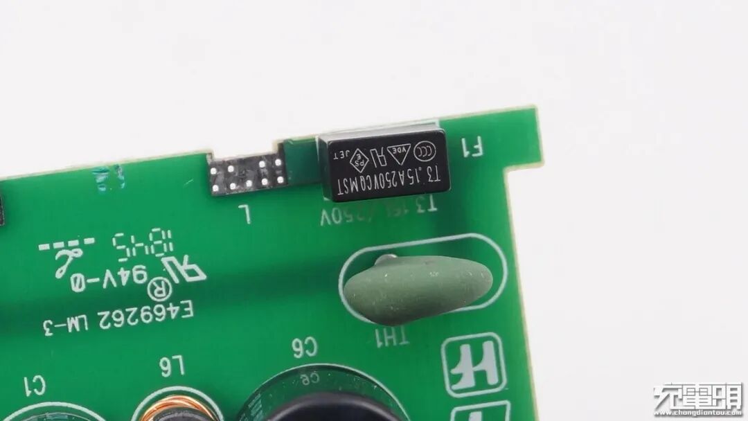 延时保险丝规格为3.15A 250V,旁边是一颗NTC浪涌抑制电阻,用于抑制上电浪涌电流。