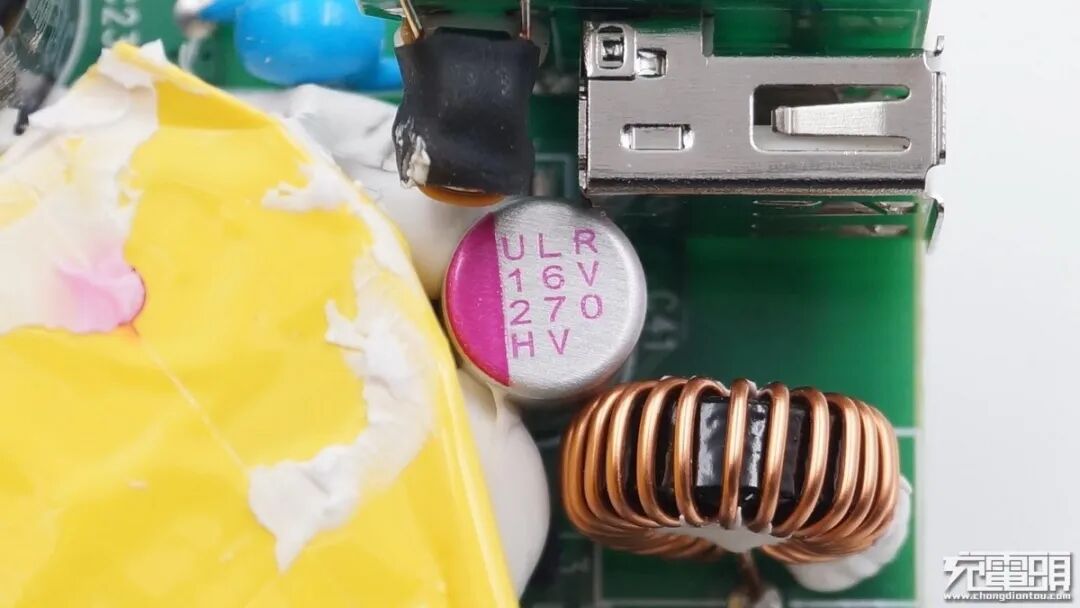 固态电容规格为16V 270μF,也是万裕ULR系列,USB-A插座后面焊接了一颗共模电感,用于输出率滤波。
