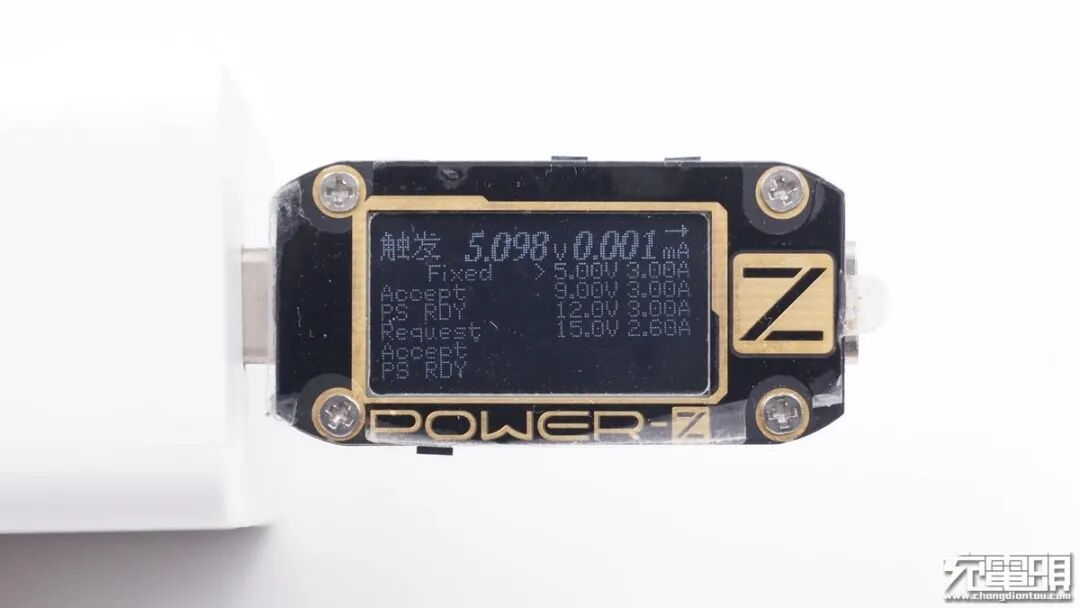 经过ChargerLAB POWER-Z KM001C检测发现USB-C口具备5V/3A、9V/3A、12V/3A、15V/2.6A四组固定电压档位。