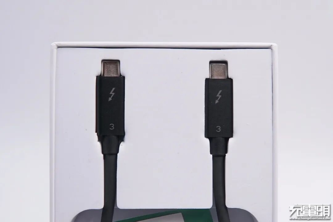 此外线身上还贴有一个参数标签,上面印有Thunderbolt 3 USB-C Cable,100W,0.5m和40Gbps规格参数。