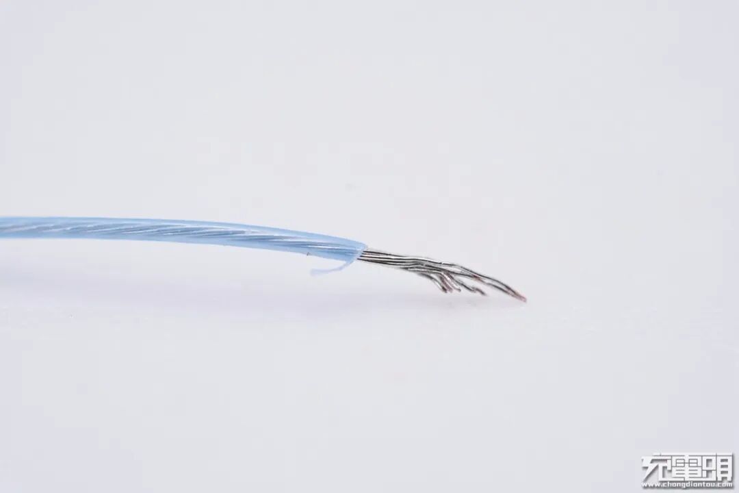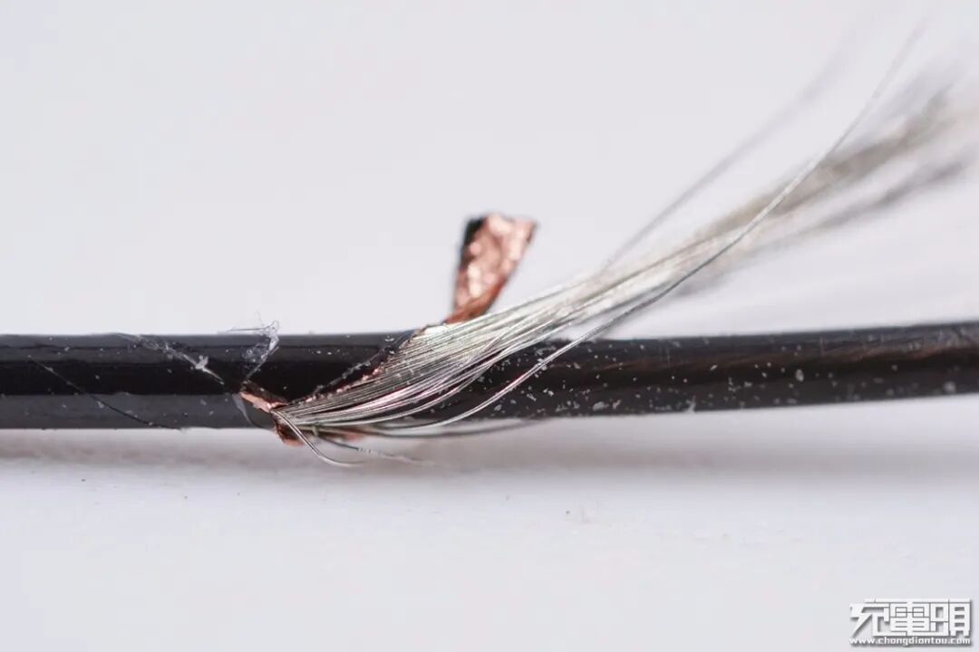 将线身切开一个斜面,内部是线径大小不一总共17根线芯,线缆粗壮也就在情理之中了。