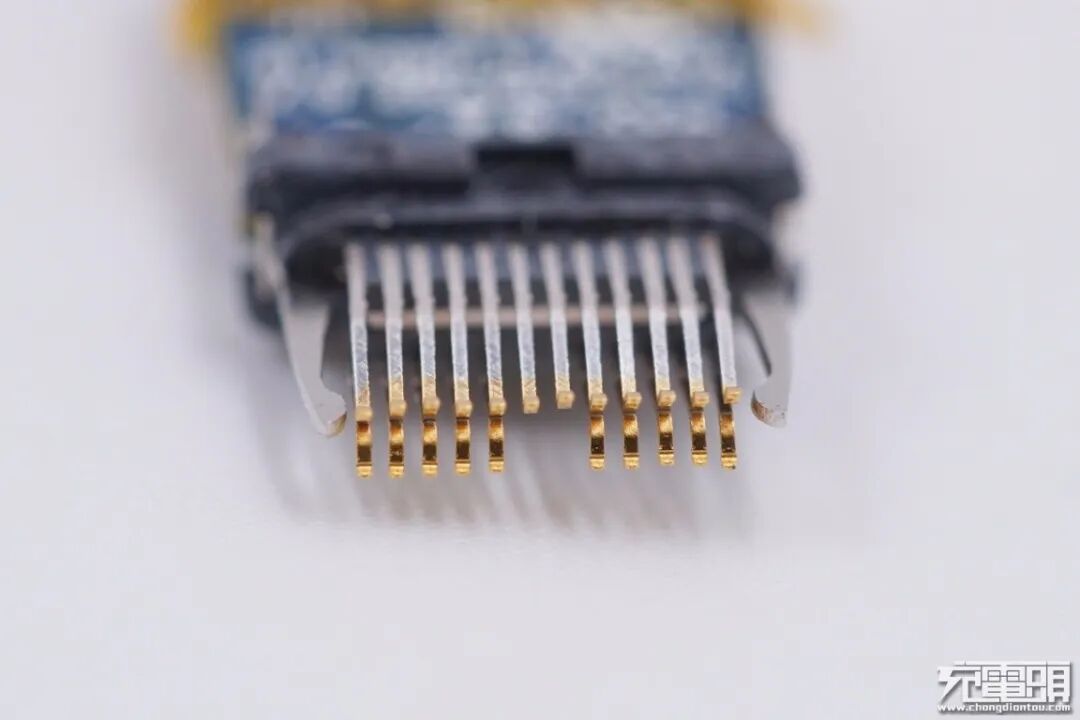 充电头网通过拆解发现,线头使用钢套点焊连接,封装牢固,内部注塑填充保护,其中一头的PCB板上有E-Marker芯片。线缆内部整整有17根线芯,线芯焊接牢固并贴有胶带绝缘。雷电3数据线采用同轴线,最里层USB传输线芯也有屏蔽层。线缆中心还设有棉线来降低线身硬值。