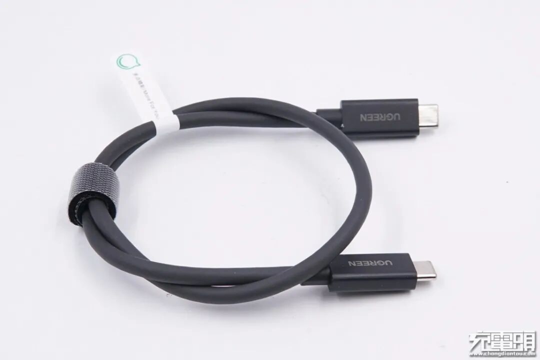 UGREEN绿联这根雷电3线不仅粗壮结实,长度约为51cm,达到了雷电3线的普遍长度标准。此外两端采用抗弯折处理,接口处进行磨砂处理方便插拔,充电头网检测发现其电力传输能力为20V/5A,数据传输能力达到40Gbps。阿卡西斯硬盘盒FA-TB34搭配这根线使用,写入速度1456.0MB/S,读取速度2364.4MB/S。