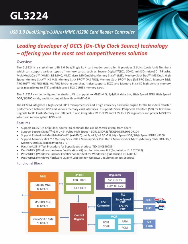 Genesys创惟GL3224,读卡器芯片,支持USB3.0,SD卡,TF卡,记忆棒的读写,还支持EMMC芯片。