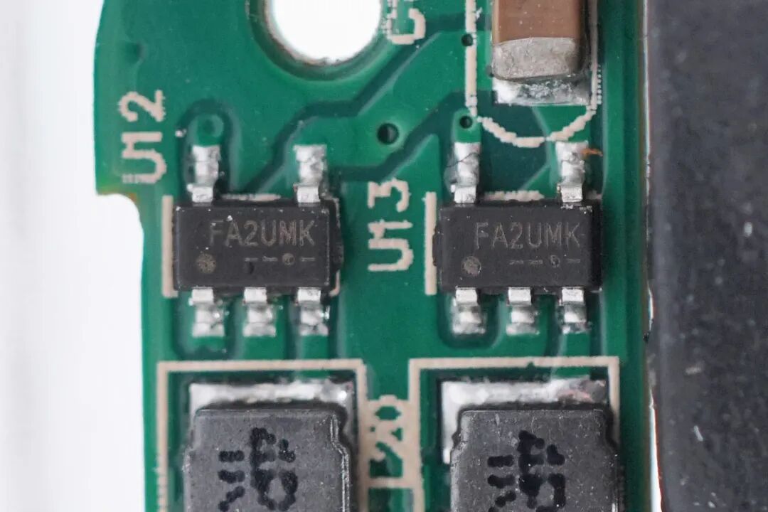 两颗天钰的FP6381A同步整流降压转换器,旁边是两颗4R7降压电感。