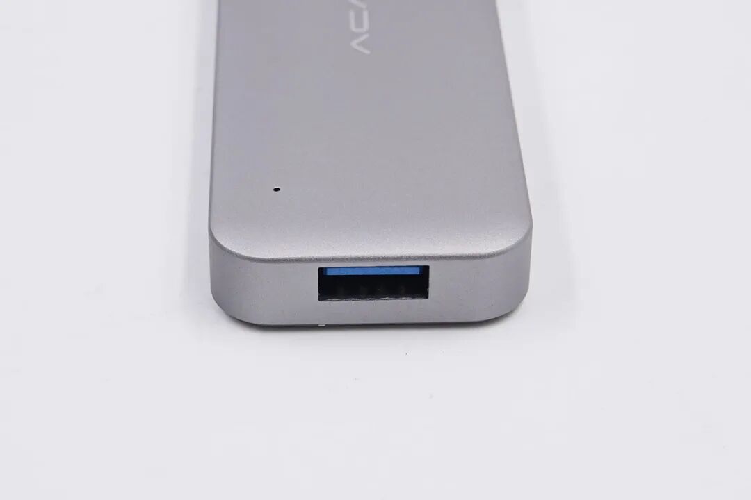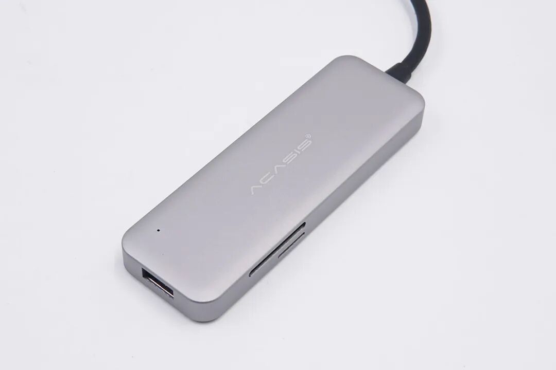 阿卡西斯这款迷你集线器机身除了底面均采用铝合金外壳,机身壳阳极氧化处理,边角过渡圆润,拿起来不硌手而且触摸手感好。机身上镭雕ACASIS品牌,造型修长扁平小巧精致。
