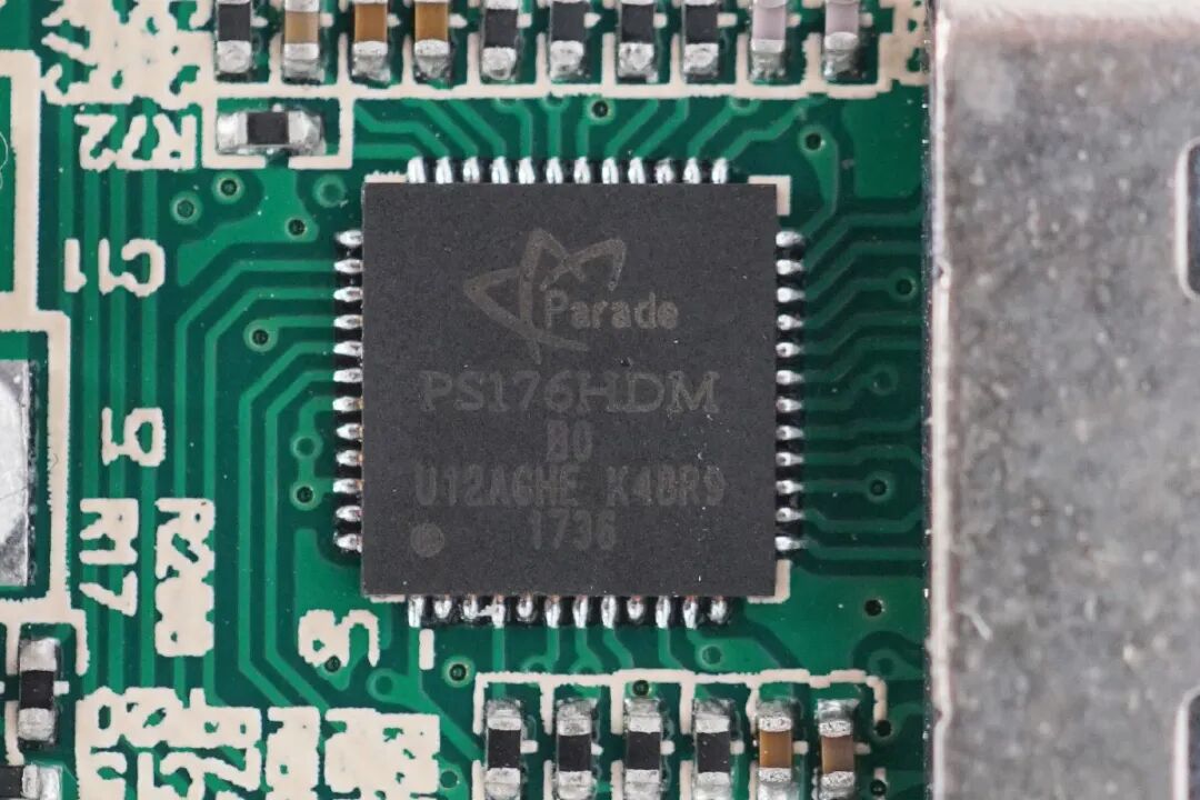 Parade谱瑞PS176HDM DP转HDMI芯片,将USB-C口中的DP信号转为HDMI,充电头网了解到采用这款芯片的还有ACASIS阿卡西斯多功能转换器AC-CM056、三星DeX Station智能手机扩展坞、联想USB-C迷你集线器、华为高清投屏连接线(CP76)、Moshi摩仕 USB-C多媒体转接器等产品。