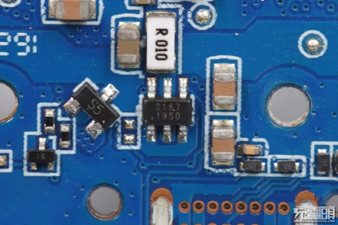 接口背面的保护MOS管,与正面管子并联,上方有一颗检流电阻检测输入电流。
