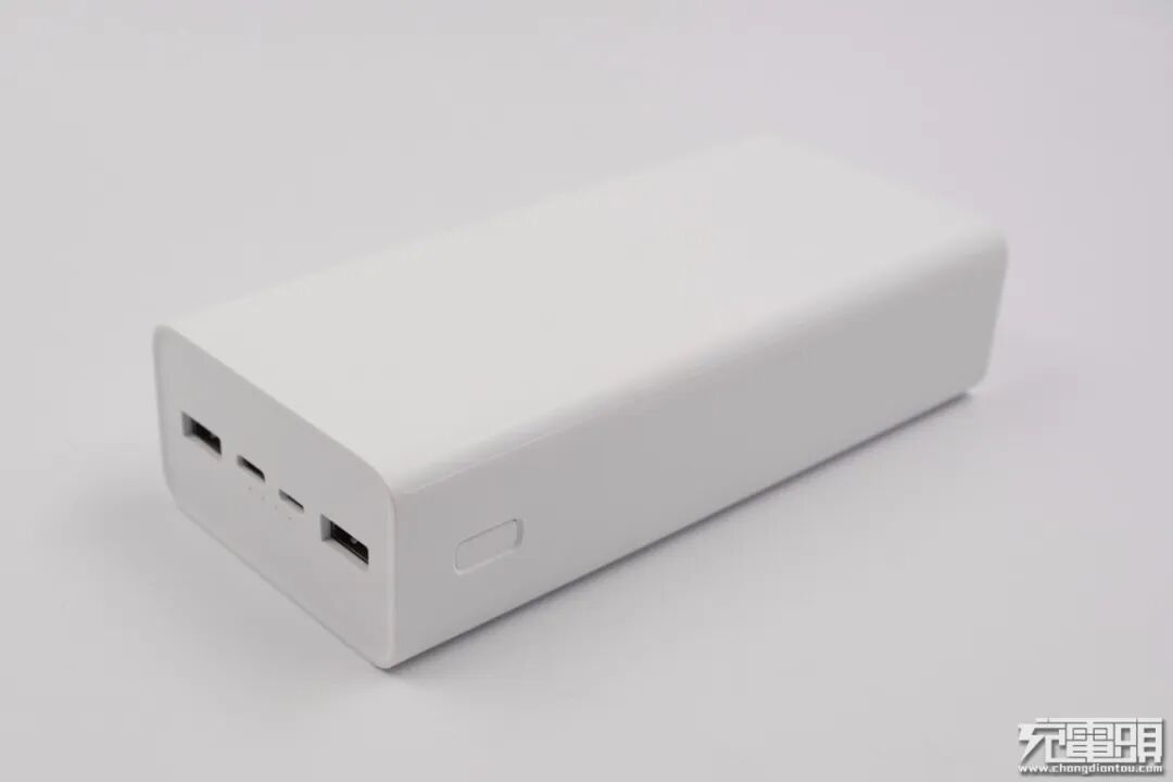 移动电源采用PC阻燃材质白色外壳,表面哑光处理,侧身弧面过渡,整体触摸手感好不硌手。