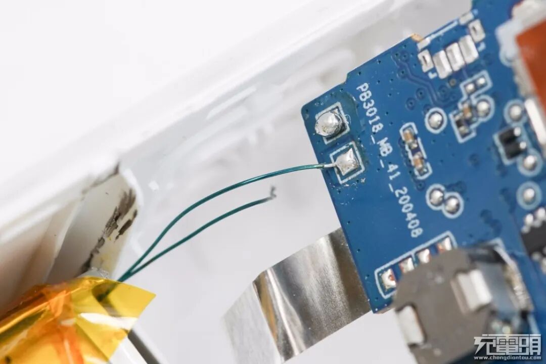 将机身壳拆开,电芯上有涂有硅胶帮助固定和导热,PCB板上覆盖一块塑料板。
