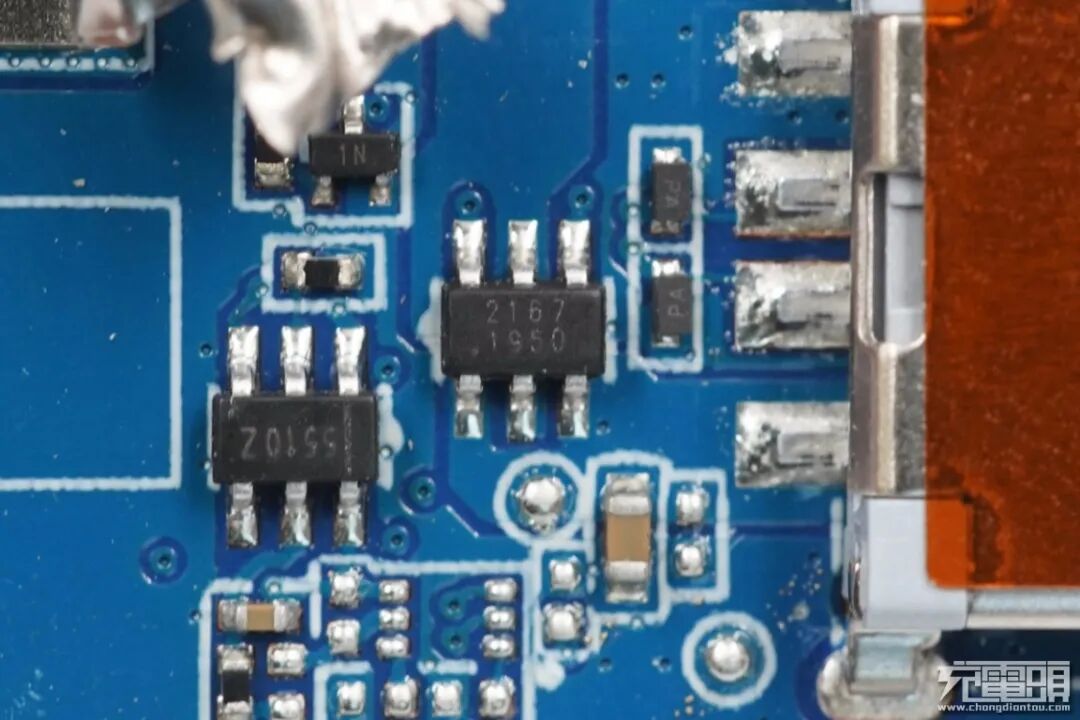 USB-A输出切换MOS管同样是WNMD2167,旁边是电池保护芯片,丝印5510Z,USB-A口数据脚对地有ESD二极管进行静电防护。