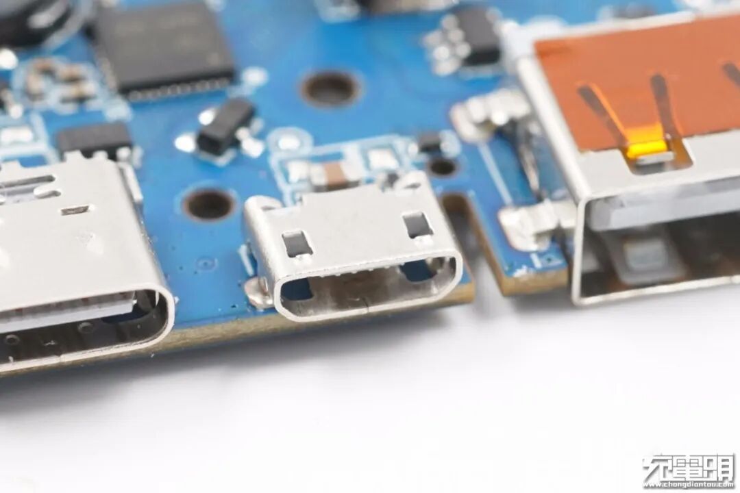 经过对PCB板正背面电路观察分析发现,小米30000mAh快充移动电源采用一颗主控芯片进行升/降压转换实现四口任一口快充输入/输出架构,3片电芯并联。下面我们就从输入端开始一一了解各元器件。