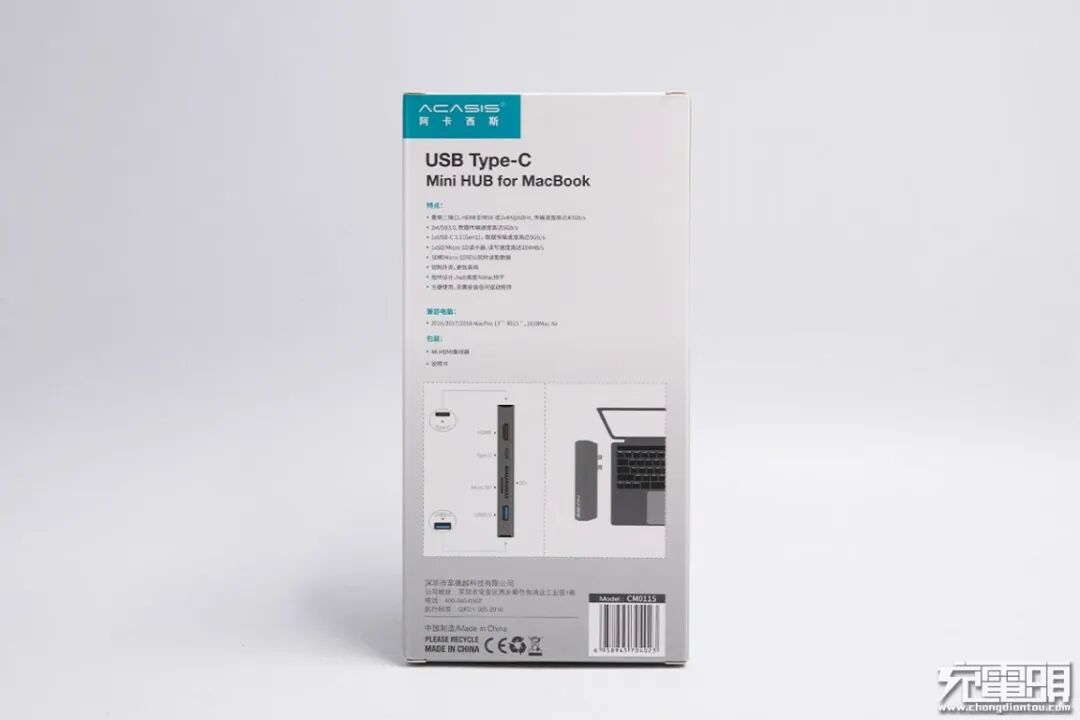 包装盒正面中间位置印有产品外观图,上端印有ACASIS阿卡西斯品牌和USB Type-C Mini HUB for MacBook,下端设计有产品六大特性标识和CM011S型号。