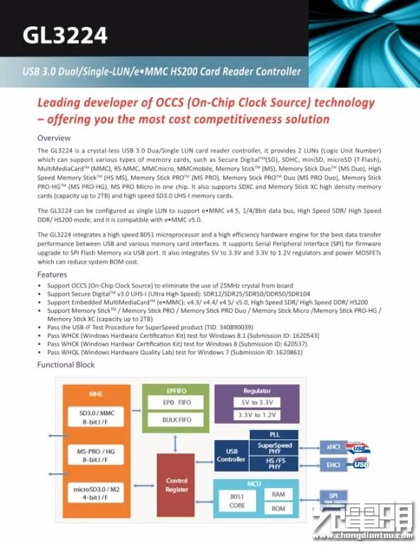 Genesys创惟GL3224,USB3.0 读卡器芯片,支持USB3.0,SD卡,TF卡,记忆棒的读写,还支持EMMC芯片。