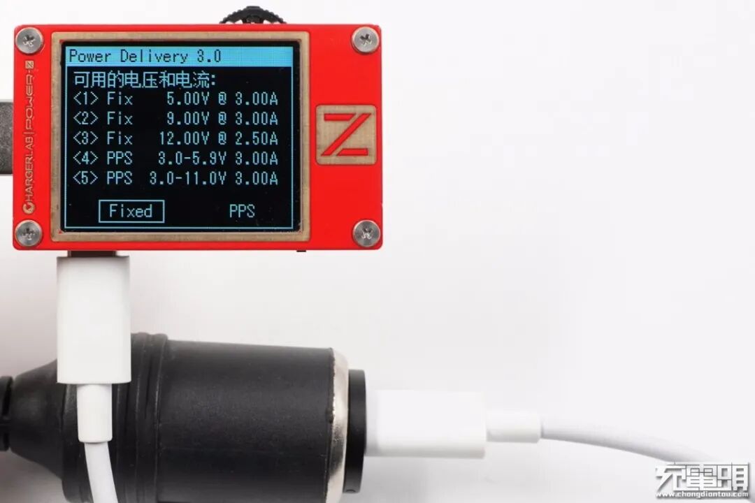 使用外接电源为车充输入24V,模拟真实车载环境,使用ChargerLAB POWER-Z KT002检测USB-C1口的输出协议,显示支持Apple 2.4A、Samsung 5V/2A、DCP协议,以及QC2.0/3.0、AFC、FCP、SCP多个快充协议。