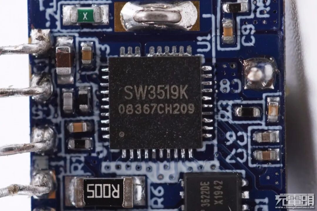 车充主控芯片采用智融SW3519。这是一款高集成度的多快充协议双口充电芯片,支持A+C口任意口快充输出,支持双口独立限流。其集成了5A高效率同步降压转换器,内置开关管,节省空间。内置电荷泵,可驱动NMOS作为VBUS开关管。支持 PPS/PD/QC/AFC/FCP/SCP/PE/SFCP等多种快充协议,CC/CV模式,以及双口管理逻辑。外围只需少量的器件,即可组成完整的高性能 多快充协议双口充电解决方案。
