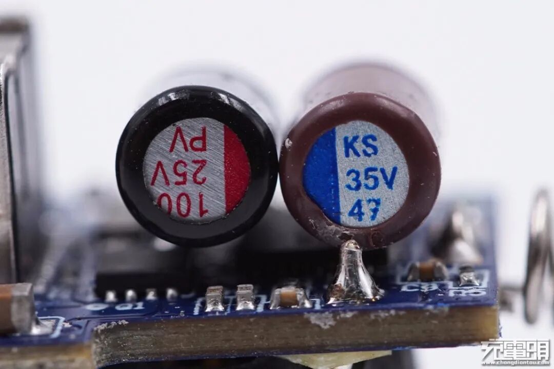 两颗固态电容特写,规格分别是25V 100μF和35V 47μF,这里分别用于输入和输出滤波。