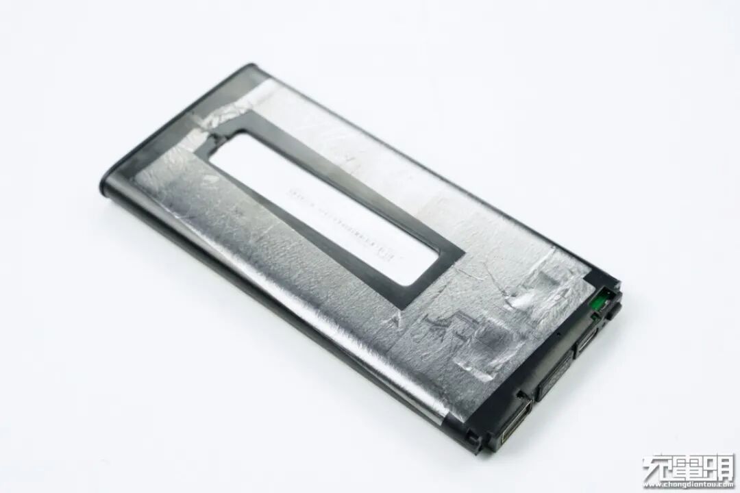 将电芯和PCB板取出,两者之间有隔离板进行隔离,电芯区域两侧贴有双面胶,电路板区域有两块导热垫,将PCB发热传导至石墨导热贴。