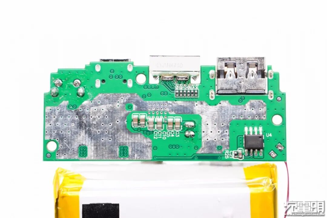 经过对PCB板正背面电路观察分析发现,魅族10000mAh 22.5W快充移动电源采用一颗主控芯片进行升/降压转换实现双口任意口快充输入/输出架构。下面我们从电芯放电到两路输出来一一了解各元器件。