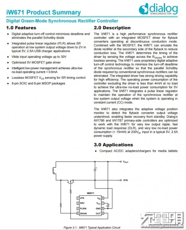 Dialog iW671数字绿色模式同步整流控制器,用于变压器输出整流。